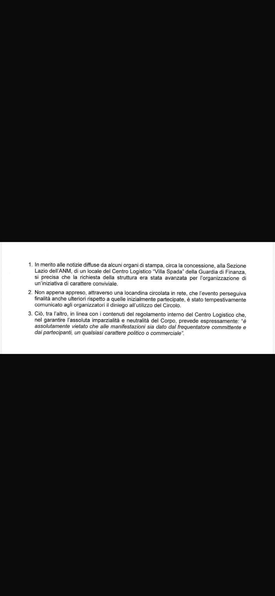 La nota della Guardia di Finanza precisa, che “circa la concessione, alla Sezione Lazio dell’Anm, di un locale del Centro Logistico ‘Villa Spada’ della Guardia di Finanza, la richiesta della struttura era stata avanzata per l’organizzazione di un’iniziativa di carattere conviviale. Non appena appreso – continua la nota – attraverso una locandina circolata in rete, che l’evento perseguiva finalità anche ulteriori rispetto a quelle inizialmente partecipate, è stato tempestivamente comunicato agli organizzatori il diniego all’utilizzo del Circolo. Ciò, tra l’altro in linea con i contenuti del regolamento interno del Centro Logistico che, nel garantire l’assoluta imparzialità e neutralità de Corpo, prevede espressamente: ‘è assolutamente vietato che alle manifestazioni sia dato dal frequentatore committente e dai partecipanti, un qualsiasi carattere politico o commerciale'”.